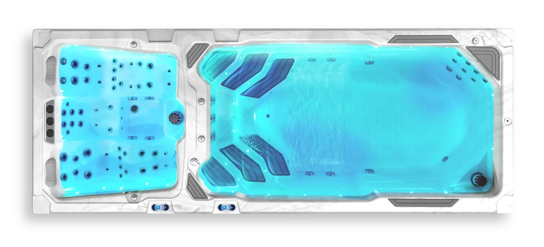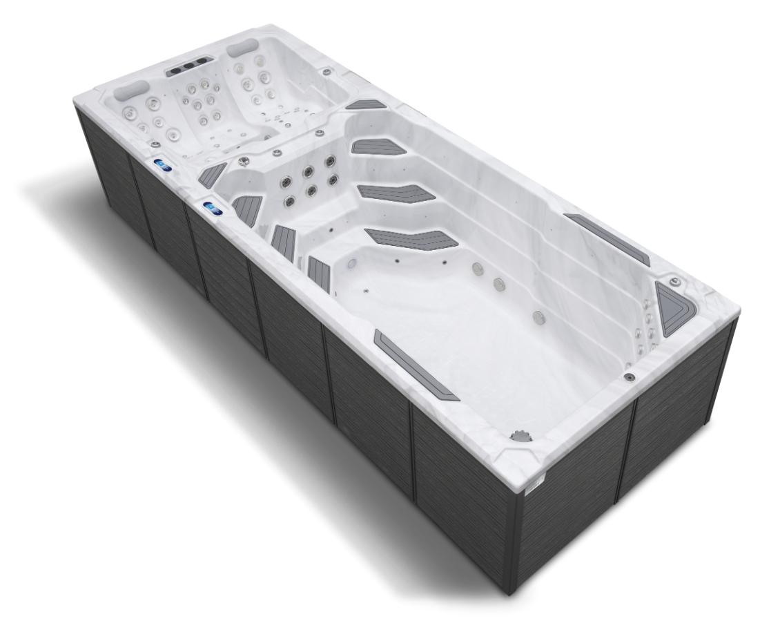 Nautilus XXL Prime to rewolucyjne Swim Spa, które łączy w sobie sportową wydajność oraz estetykę, inspirowaną luksusowymi jachtami. Dzięki powierzchniom z antypoślizgowym wykończeniem Aqua Grip Master Shield™, poczujesz się jak na jachcie, ciesząc się bezpieczeństwem ruchu zarówno w obrębie basenu, jak i wokół niego.Centralny system przeciwprądu TYPHOON oszczędza przestrzeń i wydłuża efektywną długość toru pływackiego aż o 70 cm, zapewniając jednocześnie gładki, pozbawiony turbulencji przepływ. Wejścia z obu stron przypominają eleganckie platformy załadunkowe jachtów – są funkcjonalne, bezpieczne i estetyczne.Część z wanną do hydromasażu obejmuje głęboki fotel masujący oraz panoramiczną strefę relaksu z dwoma leżankami unoszącymi się nad wodą. Odpoczynek z widokiem na strefę aktywną to niezrównane doświadczenie, które harmonijnie łączy estetykę z funkcjonalnością.